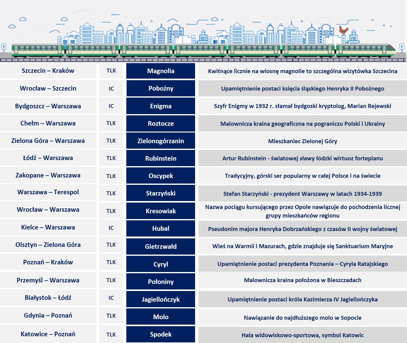 Do Krakowa „Cyryl” (Ratajski, nie Metody), do Gdyni „Molo”, Katowice „Spodek”.